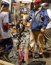Plumber Mike's masterpiece is the tall bike SCRUBMASTER to which he has welded extra valves, chains and souvenirs salvaged from old building boiler rooms. |