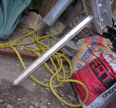 This is the TV Smashing Machine. It exists solely to smash televisions, although it is quite adept at smashing other things. It's basically a trebuchet that fires downwards. The power is delivered by garage-door springs. It's loaded by a boat winch. The spike is made from 2" bolt stock. The trigger is a quick-release link from a sailing supply store.