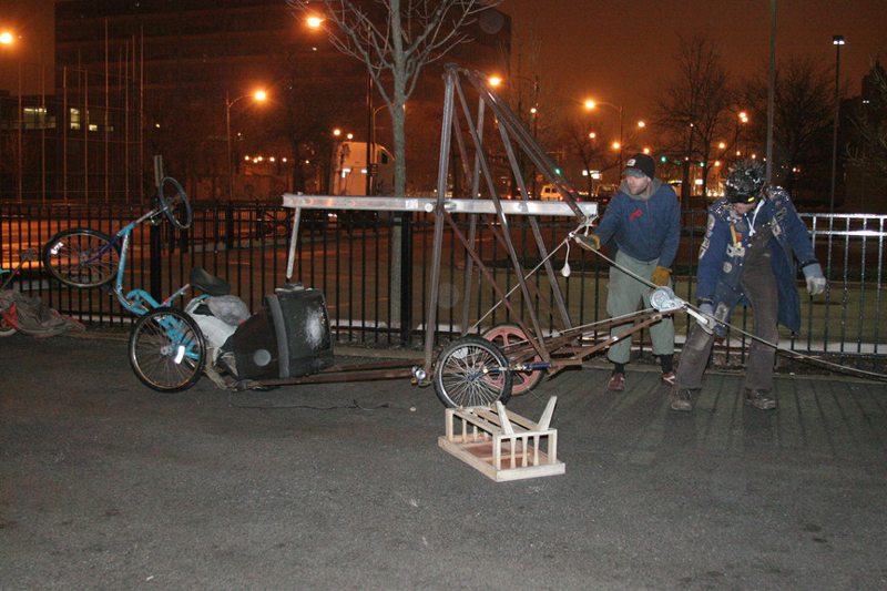 We crewed the machine like it was a piece of artillery. There was a triggerman, a loader, a broom, and a shovel. The boom is cranked back until it's about at the level of Silken's hand. The trigger line trails off to the right. Everybody gets out of the path of the machine, and then the trigger is pulled....